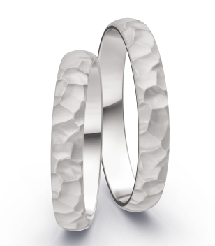 Prachtige witgouden trouwringen. De ringen zijn afgwerkt met een hammermat structuur. De ring is 3,5 mm breed en 1,45 mm dik. De natuurlijke schoonheid en betekenis van hammermat geeft de ringen een tijdloze uitstraling. Ze zijn niet alleen een prachtige accessoire op je trouwdag, maar zullen ook jarenlang een dierbare herinnering blijven.