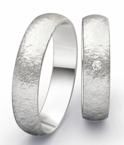 Prachtige witgouden trouwringen. De ringen zijn afgwerkt met een ijsmat structuur. In de damesring zit een schitterende briljanten van 0.03 ct in. De ring is 5 mm breed en 1,6 mm dik. De natuurlijke schoonheid en betekenis van ijsmat geeft de ringen een tijdloze uitstraling. Ze zijn niet alleen een prachtige accessoire op je trouwdag, maar zullen ook jarenlang een dierbare herinnering blijven.