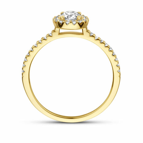 14k Geelgouden ring uitgevoerd met schitterende diamanten. De ring heeft een breedte van 7mm .