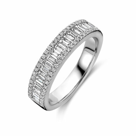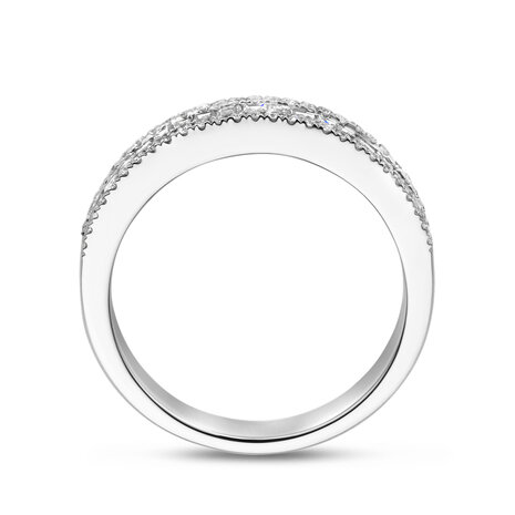 14k Witgouden ring uitgevoerd met schitterende diamanten. De ring heeft een breedte van 4.5mm. De diamantgewicht is 0.76ct.