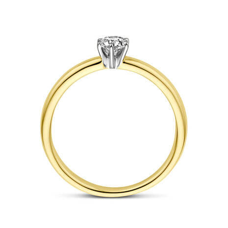 14k Bicolor geel- en witgouden ring uitgevoerd met een schitterende diamant. De ring heeft een breedte van 5mm.