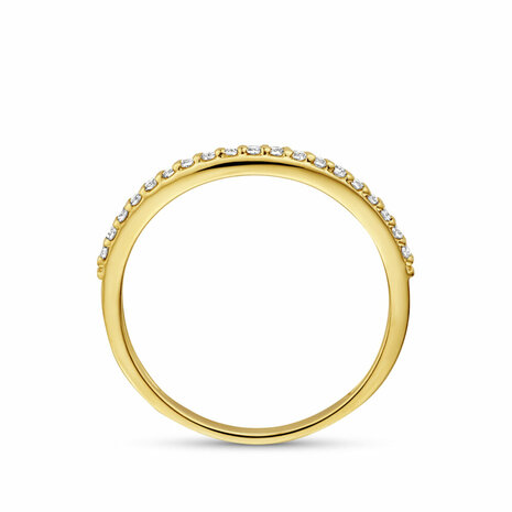 14k Geelgouden ring uitgevoerd met lab grown diamant. Het totale diamantgewicht van de ring is 0.19ct. Lab grown diamanten zijn diamanten die ontstaan in een laboratorium. Onder extreem hoge druk en temperatuur wordt het natuurlijk ontstaansproces nagebootst met als eindresultaat een diamant met dezelfde chemische eigenschappen maar met een andere oorsprong.