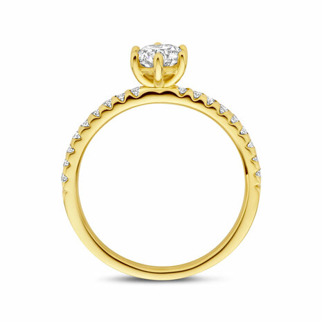 14k Geelgouden ring uitgevoerd met lab grown diamant van 5mm. Het totale diamantgewicht is 0.71ct. Onder extreem hoge druk en temperatuur wordt het natuurlijk ontstaansproces nagebootst met als eindresultaat een diamant met dezelfde chemische eigenschappen maar met een andere oorsprong.