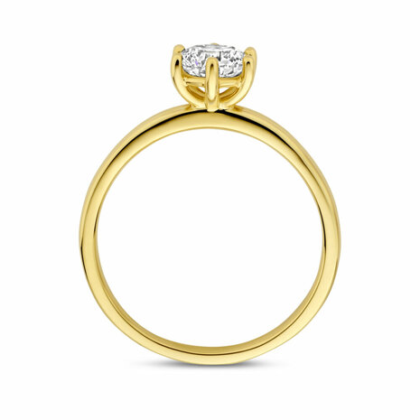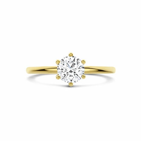 14k Geelgouden ring uitgevoerd met lab grown diamant van 6mm. Het totale diamantgewicht is 0.75ct. Onder extreem hoge druk en temperatuur wordt het natuurlijk ontstaansproces nagebootst met als eindresultaat een diamant met dezelfde chemische eigenschappen maar met een andere oorsprong.