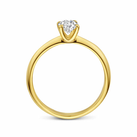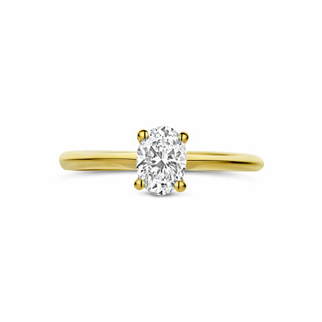 14k Geelgouden ring uitgevoerd met lab grown diamant. De ring heeft een afmeting van 6.5x4.5mm. Het totale diamantgewicht is 0.50ct. Onder extreem hoge druk en temperatuur wordt het natuurlijk ontstaansproces nagebootst met als eindresultaat een diamant met dezelfde chemische eigenschappen maar met een andere oorsprong.