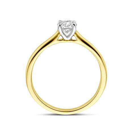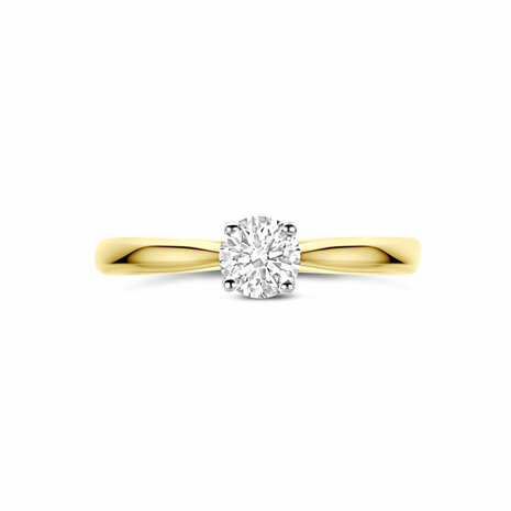 14k Bicolor geel- en witgouden ring uitgevoerd met een lab grown diamant met een totaalgewicht van 0.50ct. Lab grown diamanten zijn diamanten die ontstaan in een laboratorium. Onder extreem hoge druk en temperatuur wordt het natuurlijk ontstaansproces nagebootst met als eindresultaat een diamant met dezelfde chemische eigenschappen maar met een andere oorsprong.