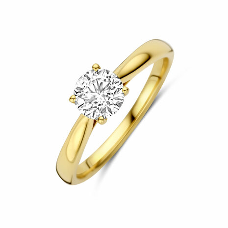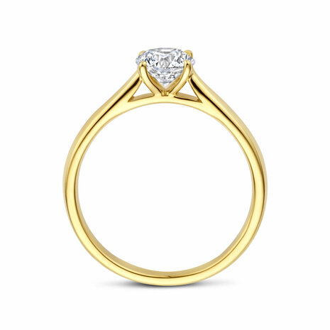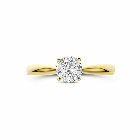 14k Geelgouden ring uitgevoerd met lab grown diamant. De ring heeft een breedte van 6mm. Lab grown diamanten zijn diamanten die ontstaan in een laboratorium. Onder extreem hoge druk en temperatuur wordt het natuurlijk ontstaansproces nagebootst met als eindresultaat een diamant met dezelfde chemische eigenschappen maar met een andere oorsprong.