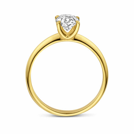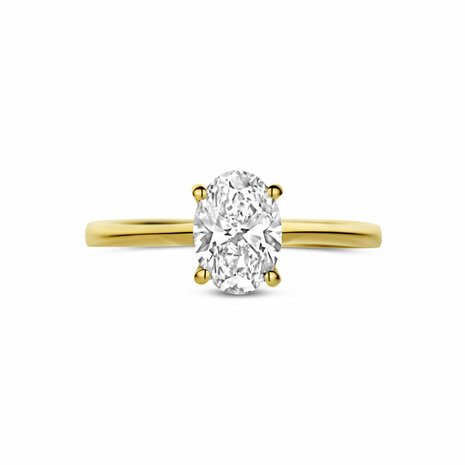 14k Geelgouden ring uitgevoerd met lab grown diamant. De ring heeft een afmeting van 8x5.5mm. Het totale diamantgewicht is 1.00ct. Onder extreem hoge druk en temperatuur wordt het natuurlijk ontstaansproces nagebootst met als eindresultaat een diamant met dezelfde chemische eigenschappen maar met een andere oorsprong.