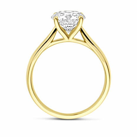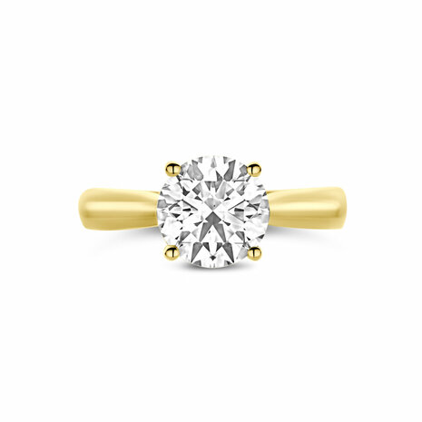 14k Geelgouden ring uitgevoerd met een lab grown diamant met een totaalgewicht van 2.00ct. Lab grown diamanten zijn diamanten die ontstaan in een laboratorium. Onder extreem hoge druk en temperatuur wordt het natuurlijk ontstaansproces nagebootst met als eindresultaat een diamant met dezelfde chemische eigenschappen maar met een andere oorsprong.