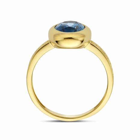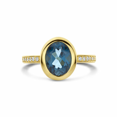 14k Geelgouden ring uitgevoerd met london blue topaas en diamant. De ring heeft een breedte van 11.5mm. Het totale diamantgewicht is 0.07ct.