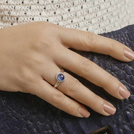 Gerhodineerd zilveren ring uitgevoerd met schitterende zirkonia en een London blue topaas steen. De ring heeft een breedte van 9.5mm.