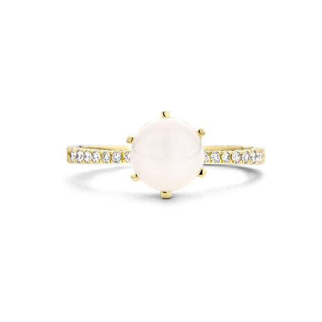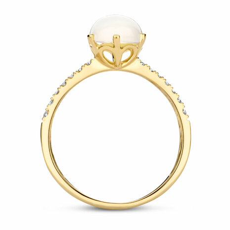 14k Geelgouden ring uitgevoerd een schitterende diamant rij en wit maansteen.