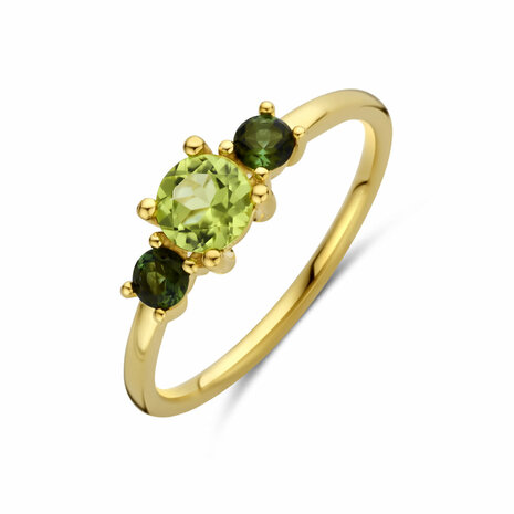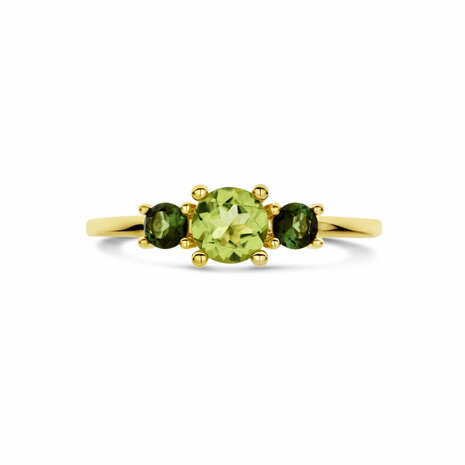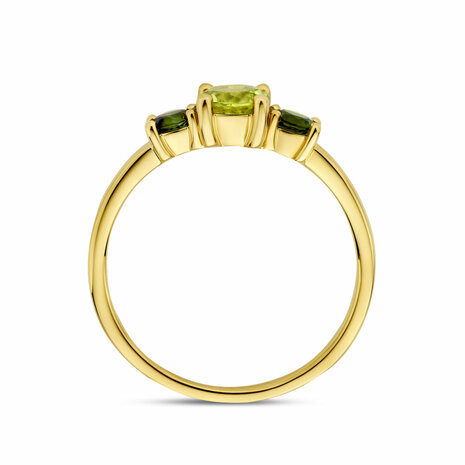 14k Geelgouden ring uitgevoerd met peridot en groen toermalijn. De ring heeft een breedte van 5mm.