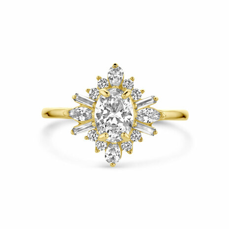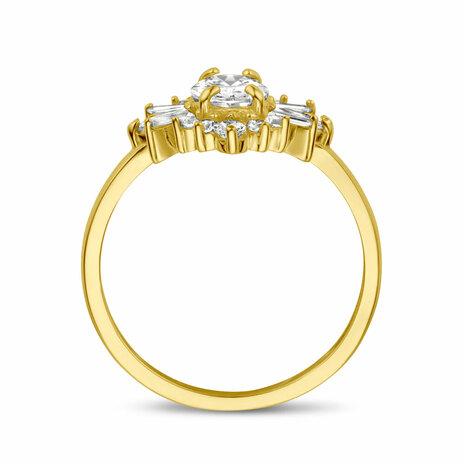 14k Geelgouden ring uitgevoerd met zirkonia. De ring heeft een breedte van 13.5mm.