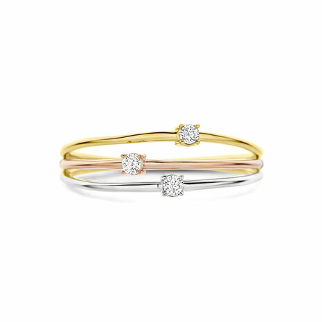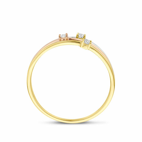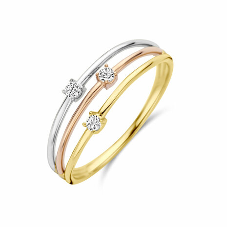 14k Tricolor geel, roze en witgouden ring uitgevoerd met zirkonia. De ring heeft een breedte van 7mm.