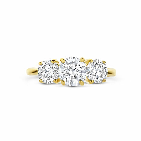 14k Geelgouden ring uitgevoerd met lab grown diamant. Het totale diamantgewicht is 2.20ct. Lab grown diamanten zijn diamanten die ontstaan in een laboratorium. Onder extreem hoge druk en temperatuur wordt het natuurlijk ontstaansproces nagebootst met als eindresultaat een diamant met dezelfde chemische eigenschappen maar met een andere oorsprong.