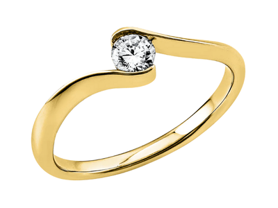 14k geelgouden ring uitgevoerd met 1 briljant. De ring heeft een sierlijke opening waar de briljant in geplaatst is.