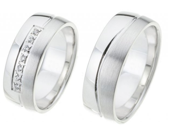Unieke trouwringen in witgoud. De ringen zijn mat en glanzend afgewerkt, in het midden loopt een sierlijke groef rondom de ring. De damesring heeft 7 fascinerende briljanten, deze ring betovert echt elk hart. De ringen zijn glanzend met mat afgewerkt en hebben een zeer moderne uitstraling. Dat maakt deze ringen zeer geliefd bij onze klanten. De briljanten schitteren op indrukwekkende wijze op dit oppervlak. Deze trouwring is van een uitzonderlijk goede kwaliteit. De trouwring is 7.0 mm breed en is ook beschikbaar in 9, 14 of 18 karaats geelgoud. Deze trouwring is ook mogelijk in geelgoud, rosegoud, platina of palladium.